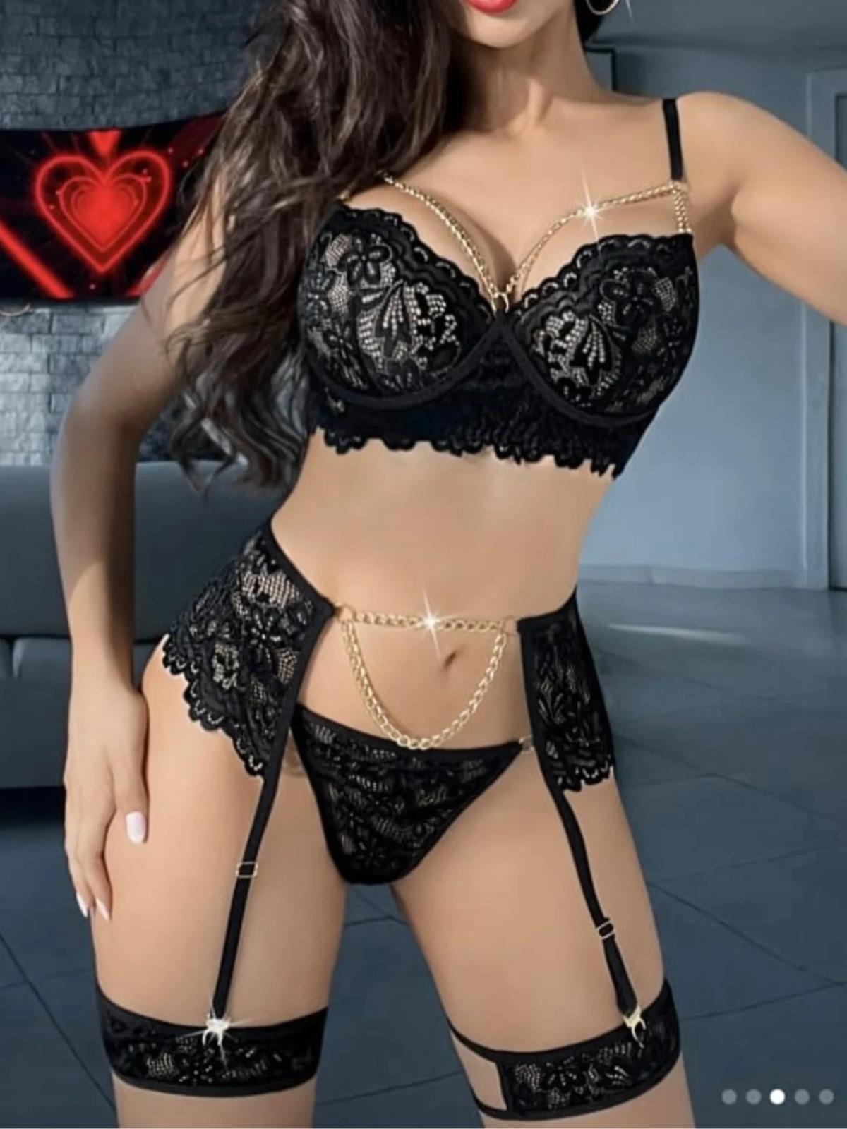 Kadın Seksi Siyah Jartiyer – Dantel Ve Zincir Detaylı Sütyen Külot Takımı